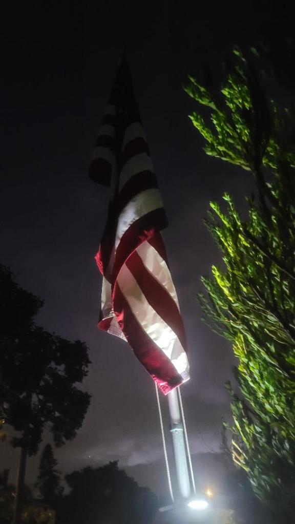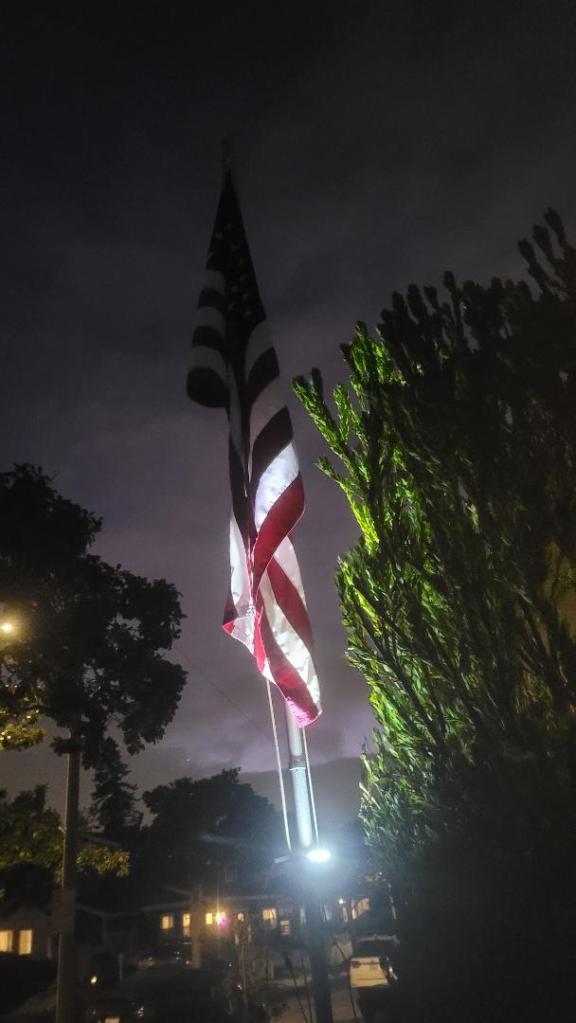 So, today I installed a solar light on the pole. I didn’t cuss too much (out loud) as I dropped tiny screws in the grass (one is still missing) and tried to figure out the non-existent directions, but so far so good. I’m still playing around with the best position to shine the light, but it’s nice to see Old Glory getting the respect she deserves.