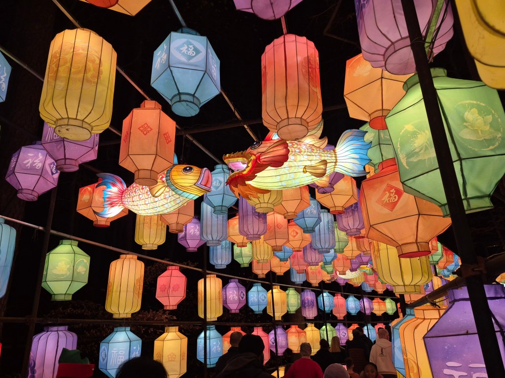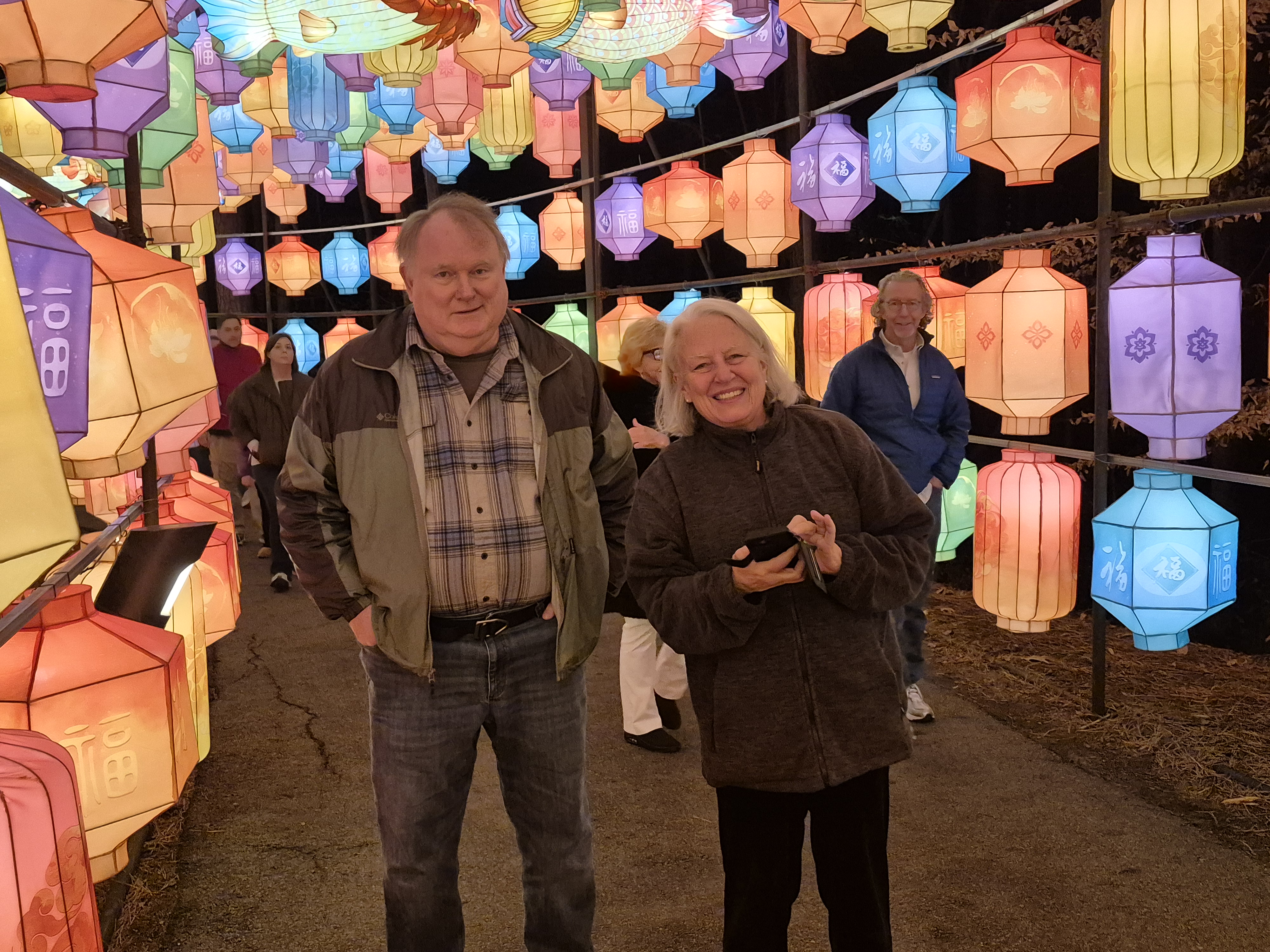 Let me take you on a tour.  Once you walk under the Dragon Gate, noting the serpentine dragon, step into the long and lovely Light Corridor.  It’s packed with 100s and 100s of softly glowing lanterns in various colors, with the occasional pair of koi overhead.   It is about 100 yards and is breathtaking, telling stories of hope, happiness, and celebration. (Cousin Rich and his wife Amelia are below – awesome hosts!)