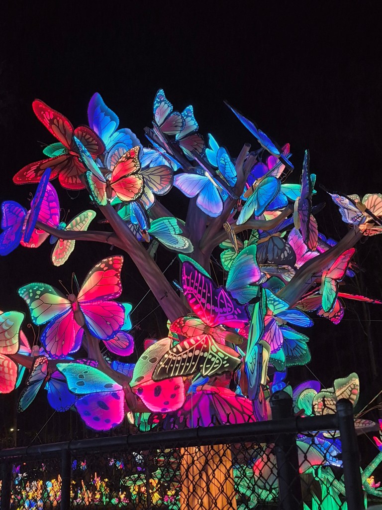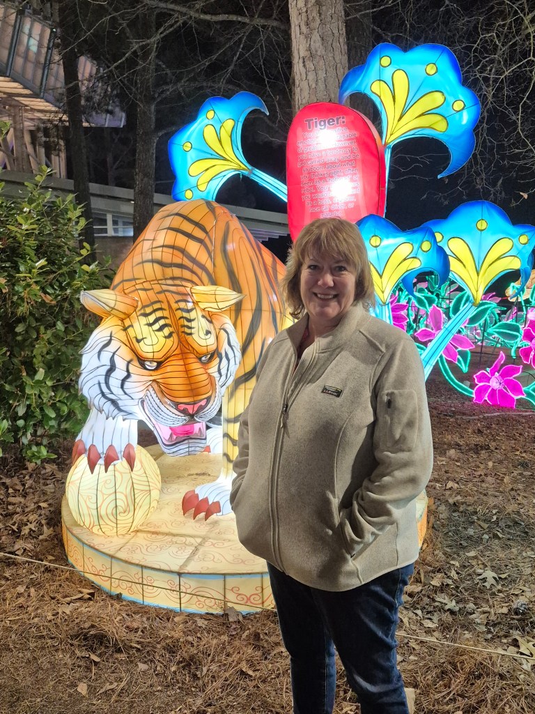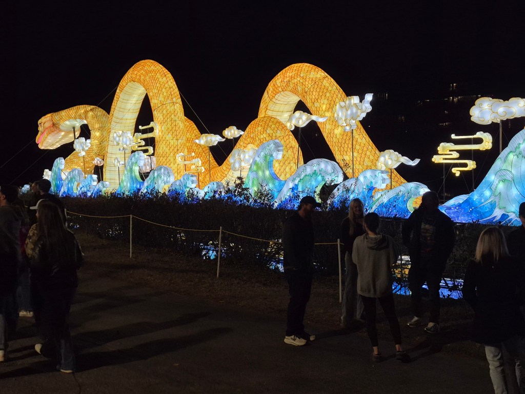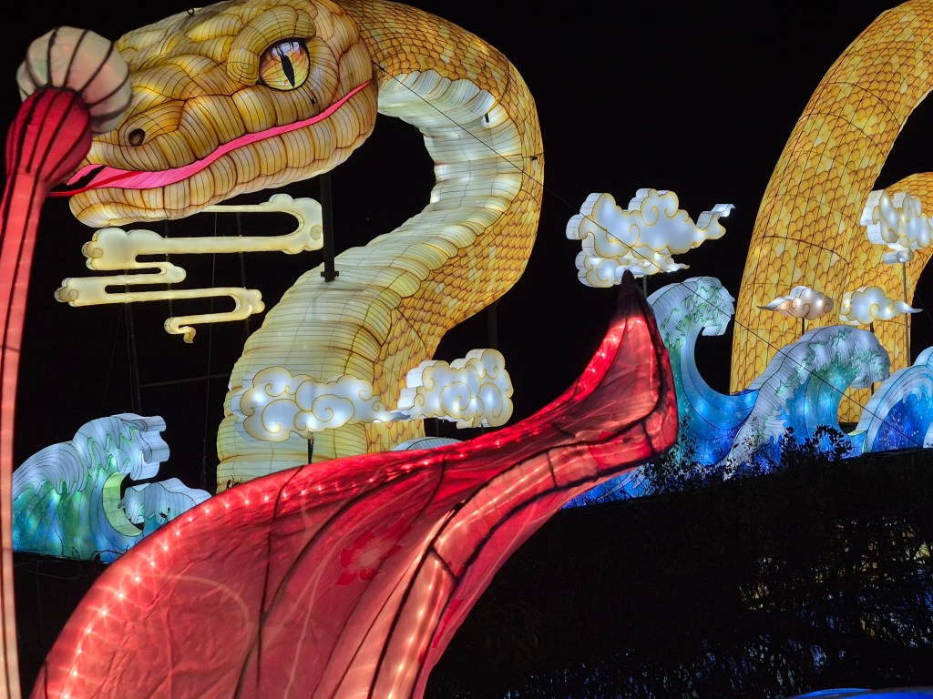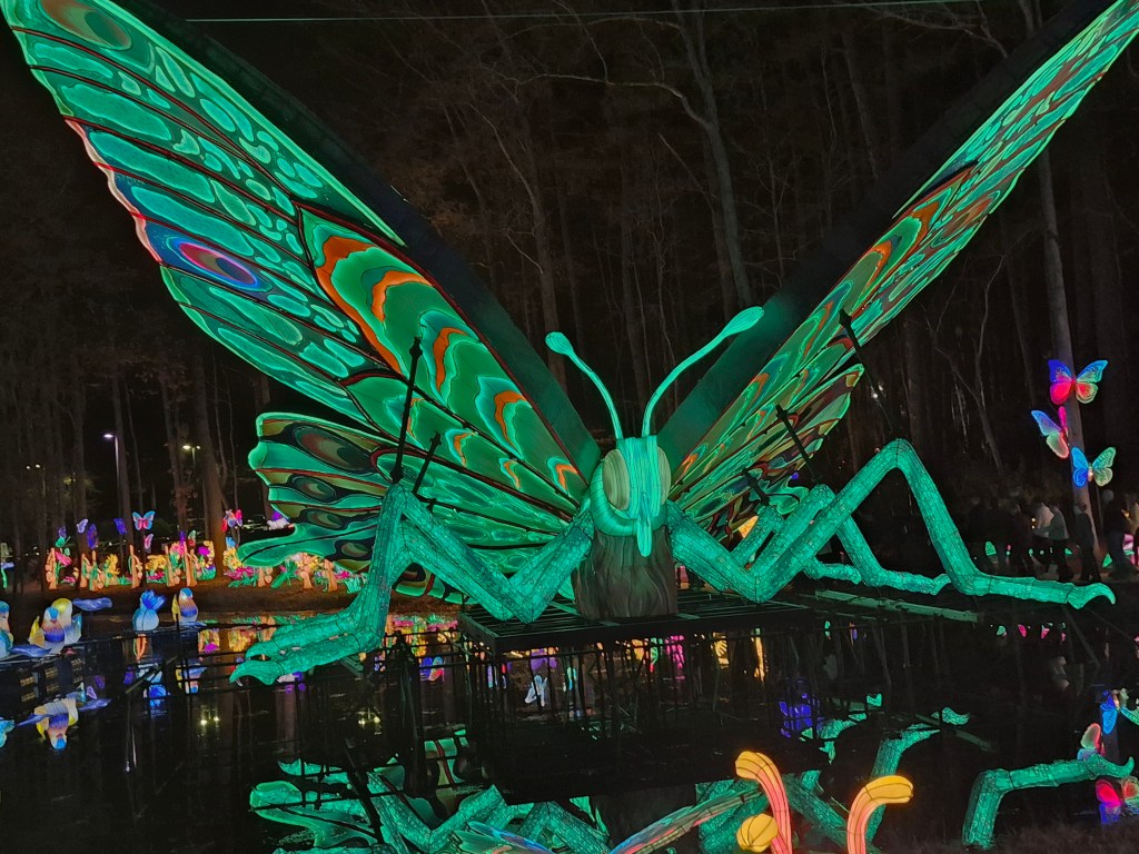 Turns out my cousin Rich bought tickets for us to attend.  OMG!  WOW!  AMAZING!  FANTASTIC!  I am not exaggerating.  These are not a bunch of round red lanterns.   This was an hour’s walk through a magical pathway filled with huge light-filled “lanterns” (steel frames and silk) dragons, butterflies, florals, Chinese Zodiac animals, and other whimsical creatures, including a 164-foot-long snake sitting on the adjacent lake.   This is the 10th year of this annual event, which takes place in December and January.  This year, about 1.3 million visitors are expected.  The lanterns arrive from China to Wilmington, NC via shipping containers and after 50 days on the water, they are trucked to the Raleigh area.  It takes 55 artisans and 18 days to set-up the festival.